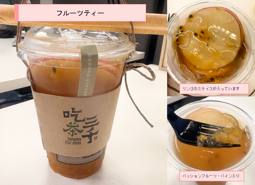 特にオススメは薄切りのリンゴやパイン、パッションフルーツ、桃、レモンがたっぷり入った豪華な一杯。まるでフルーツを食べているような感覚で、おやつ代わりにもぴったりです。軽い昼食の時などは注文します。