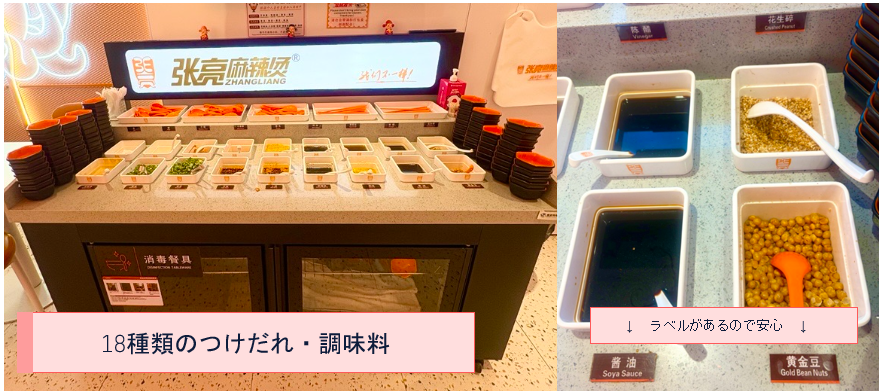 Zhang Liang(チャンラン)では、18 種類の調味料・つけだれ を自由に組み合わせて味変できる点も良いです。具材をディップして食べてもよし、スープに溶かして味を変えてもよしなので、自分好みに楽しみたい方々に大人気です。