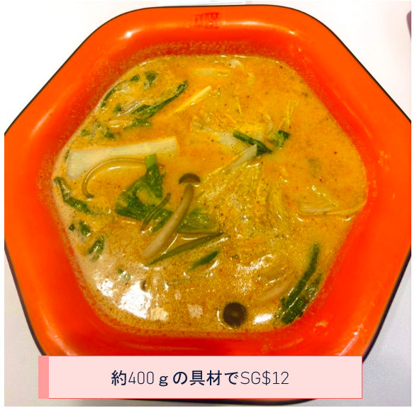 シンガポールの一例では、具材は “100g あたり S$3.08”、最低量 300g からと最低料金があるので、具材が少な目の時は注意してください。その日の気分で多めにも少な目にもできるので、調整可能で良いです。