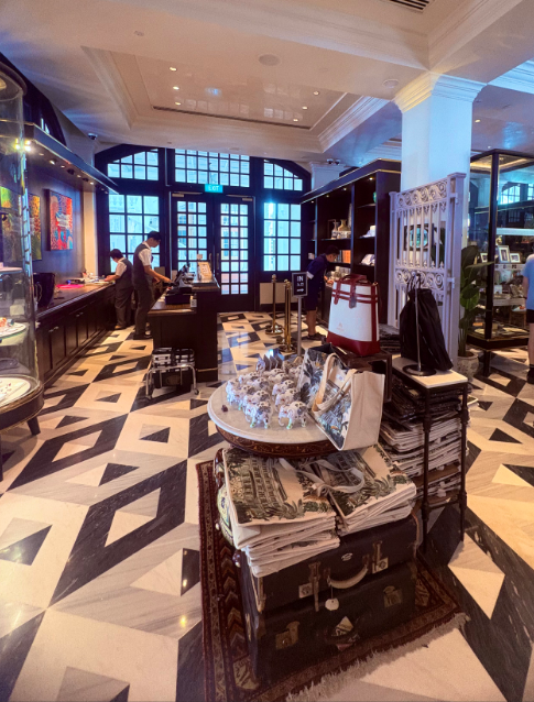そんなラッフルズホテルの一角にあるのが「ラッフルズブティック」。白を基調とした上品な空間は、まるで小さなミュージアムのような雰囲気です。歴史的なホテルの空気を感じながらショッピングを楽しめるのは、この場所ならではの体験。