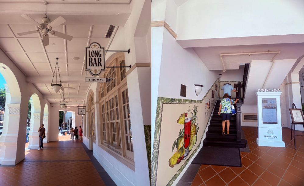 お土産選びと一緒に体験してほしいのが、ホテル内にある**ロングバー(Long Bar)**です。ここはシンガポールスリング発祥のバーとして知られ、クラシカルな内装やバーの雰囲気はまるで100年前にタイムスリップしたよう。